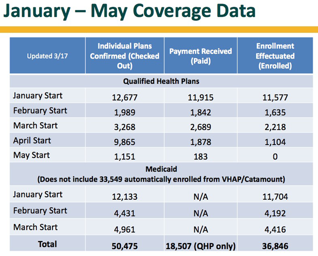 You can see this in the chart below; it's the first and second columns which are relevant. The third column appears to refer to some glitches in the system which aren't the fault of the customers, who have paid their premiums to the insurance companies. It looks like Vermont has 1,973 people who are owed a heck of an explanation (not so much the April starters, but the Jan/Feb/March starters, anyway), but 18.5K have finished the process and paid their premiums as required.