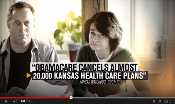 Aside from general Obamacare bashing, the ad makes one interesting claim: That "20,000 Kansans lost their healthcare because of" the ACA. The headline accompanying the narration reads "Obamacare cancels almost 20,000 Kansas health care plans" and cites "Kansas Watchdog" from 10/31/13 as the source: