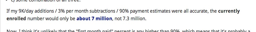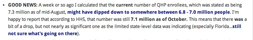 • Until the 7.3 million August figure was released, I had been estimating that the number of currently enrolled QHPs was likely around 7 million even, and I said exactly that at the time: