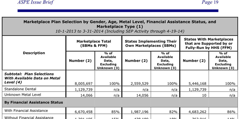 UPDATE 10:04pm: OK, Ken Kelly has pointed out another interesting tidbit: The 393,000 dental plans, which I had assumed was a huge drop from 1.1 million nationally back in April, actually represents only the dental plans from the state-based exchanges. That is, the May report stated (on page 19) that there were 1.13 million standalone dental plans on the federal exchange (Healthcare.Gov), but an unknown number from the state-based exchanges at the time: