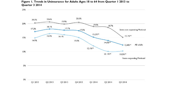Over the summer, five different respected national healthcare studies agreed that the overall uninsured rate had plummeted by at least 25% from last fall through the end of June, 2014. The methodology varied a bit from one to another; some included all adults, others only included those under 65. Some included children under 18, others didn't. Some used the September 2013 as the starting point, others started with December 2013. Even with all of these variables, though, the consensus was a 25% reduction, from roughly 42.3 million down to around 31.3 million, give or take.