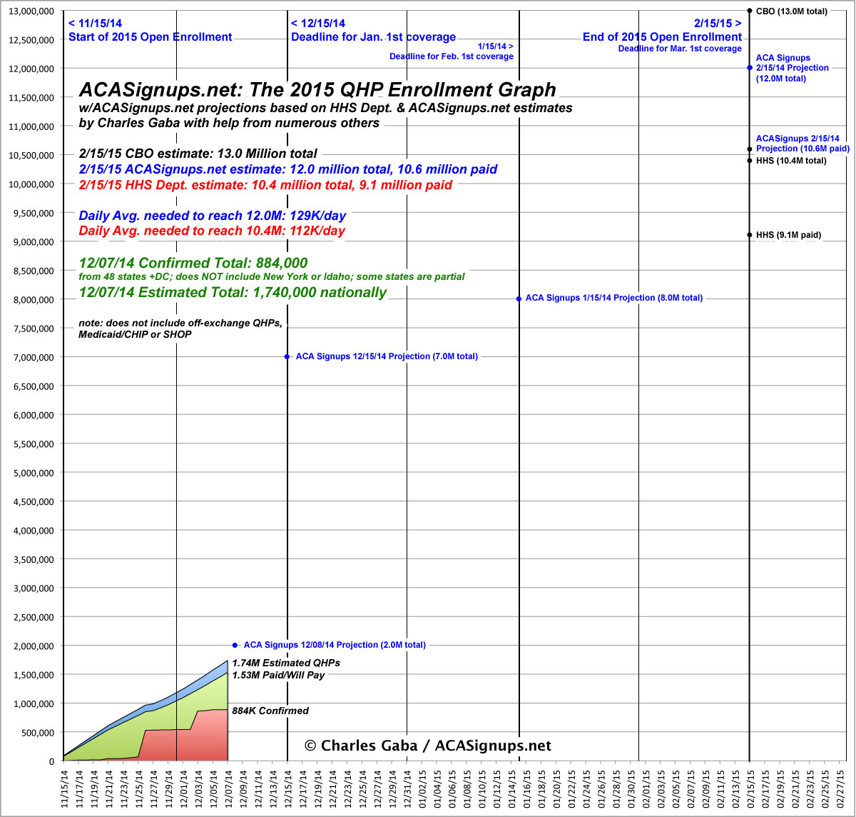 As of last night (Sunday the 7th), the totals should be roughly 1.74 million nationally (1.30 million HC.gov). Until now, enrollments nationally should have been averaging roughly 75-80K/day (except for a lull on Thanksgiving, of course).