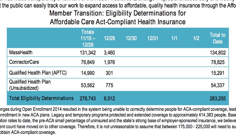 First, we have today's daily MA Health Connector Dashboard report, which states that there have been 148,453 QHP determinations thorugh yesterday (12/29). Assuming 50% of these have selected plans, that's around 74,200 QHP selections to date. In addition, the 134,803 Medicaid (MassHealth) enrollments are already locked in.