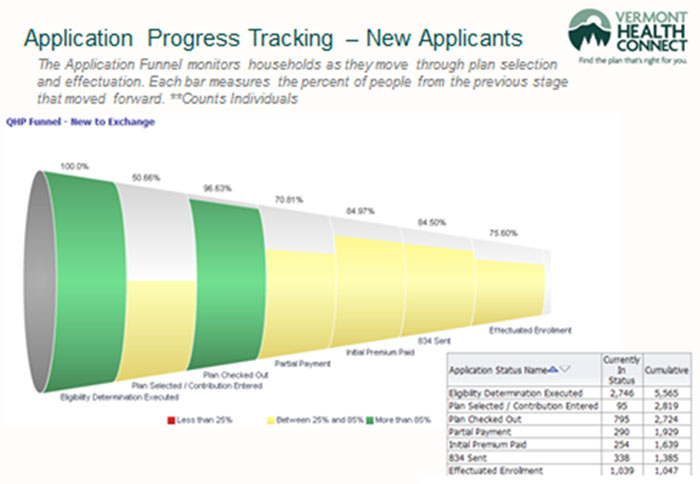 VT also includes a funky "enrollment funnel" graphic which shows how new enrollees are flowing through the system (from eligibility determination > plan selection > checkouts > payments > effectuated enrollments). Unfortunately, it's a pretty low-res graphic and difficult to read, but it's still kind of cool. Remember, this only refers to new additions, not renewals: