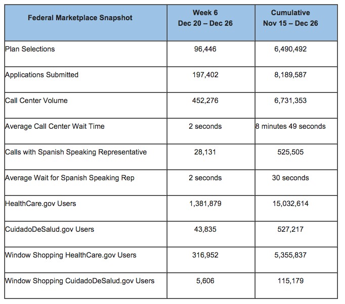 In all the fuss and bother over yesterday's monthly HHS report (which only ran through the 15th), I almost forgot about the HC.gov-only  "weekly snapshot" which was also released at the same time. This report only covers the 37 states run via the federal exchange, but is more recent; it goes all the way up through December 26th, just 5 days ago.