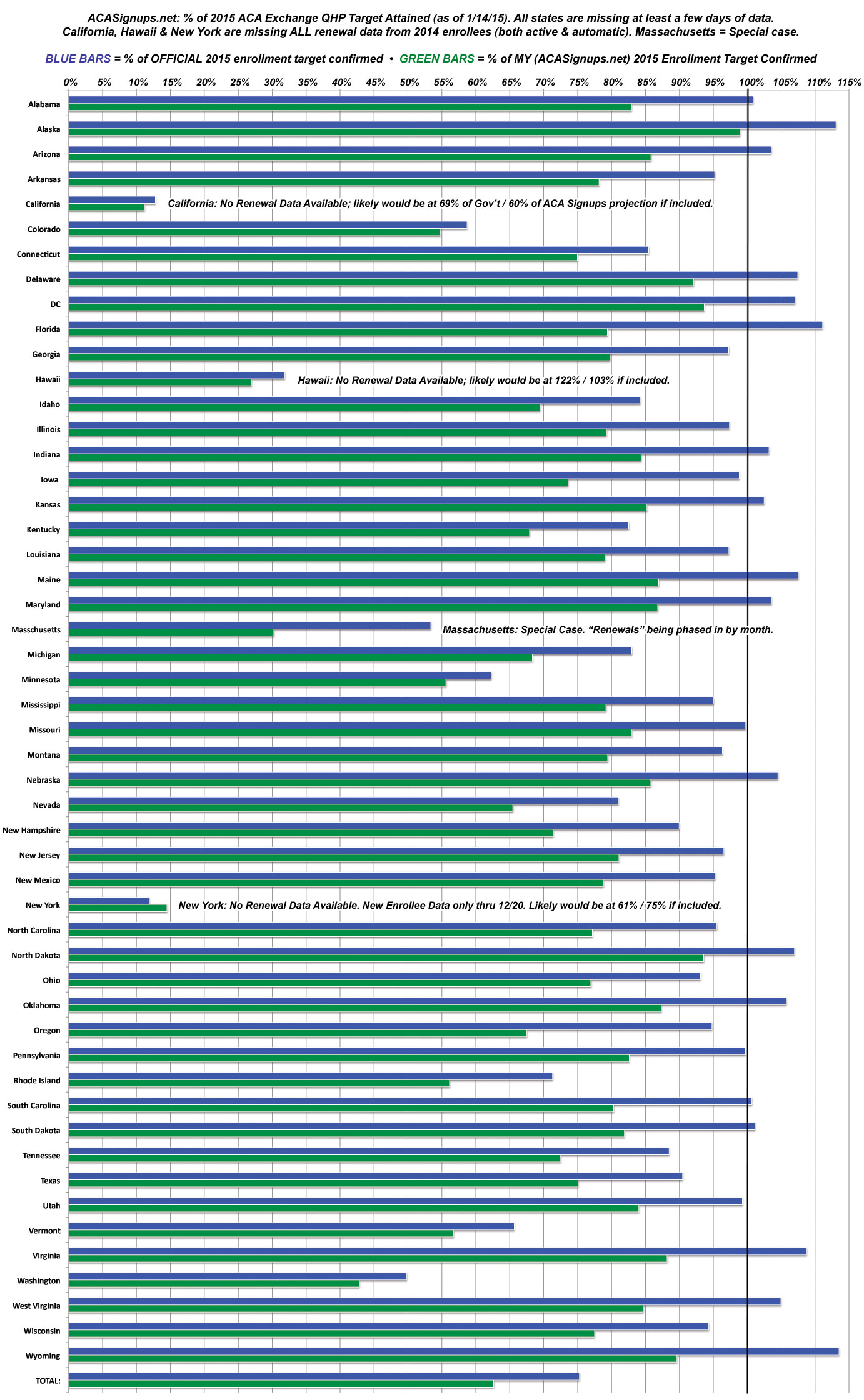 There are 4 states which have important caveats: California, Hawaii and New York are all missing renewal data from 2014 enrollees. This is huge, especially for CA and NY; there are likely up to 1.3 million "missing" 2015 enrollments based on this alone (around 960K in CA, 320K in NY and perhaps 10K in Hawaii).