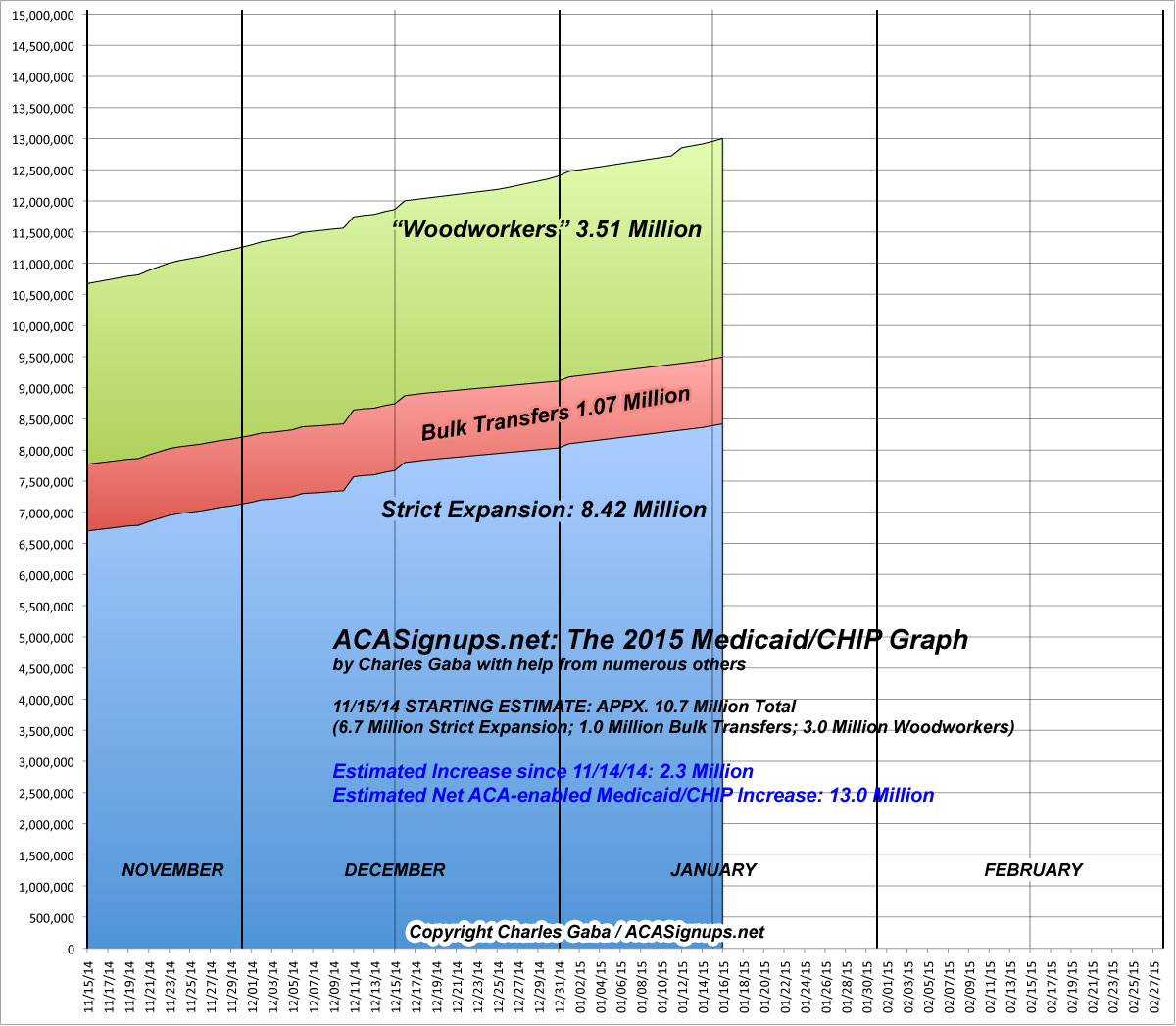 Between the corrected CA data and some other oddball Medicaid/CHIP data which has come in from other states, I'm fairly sure that the total ACA-enabled increase in Medicaid/CHIP enrollment nationally has crossed the 13 million line, broken out roughly as follows:
