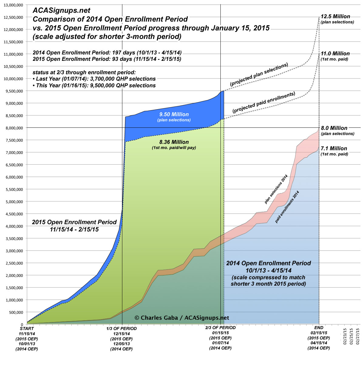 At the 2/3 point last year (around January 9th), total QHP selections were at around 3.7 million, versus the 9.5 million who should have enrolled for 2015 as of Friday night, or almost 2.6x as many. This gap will obviously close quickly once we move into the home stretch, but this period should still end with roughly a 50-60% increase over last year.