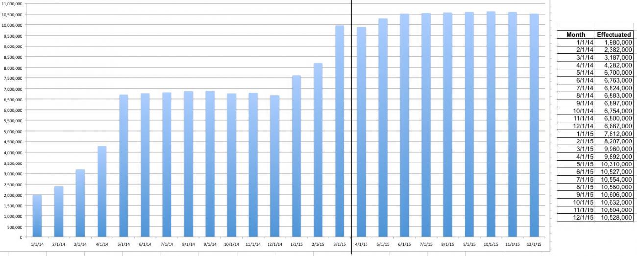 Compare this against my own estimate of the monthly effectuated enrollments nationally (2014 and 2015...everything to the right of the vertical black line is a future projection: