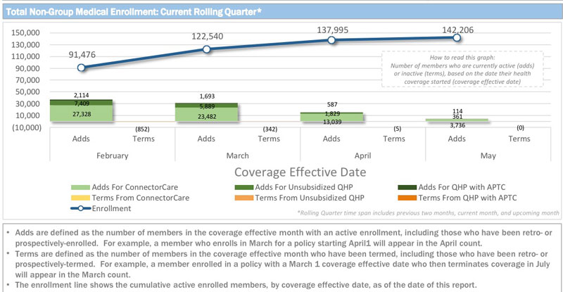 • They also lost 2,990 enrollees (1,791 in January, another 1,199 for Feb/Mar/April) due to people terminating their policies for one reason or another (life changes, etc), bringing the current effectuated QHP enrollment number down to 142,206.
