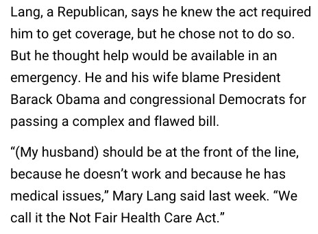 • He then accuses the Charlotte Observer of being "biased to the left" for not telling the whole story about his medical history, claming that his doctor (who had been treating him at a generously sliding scale rate) stopped offering the discount "because of the Affordable Care Act". When pressed on this point, Lang claims that due to the ACA: