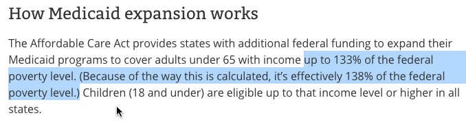 UPDATE: There's a bit of confusion about whether ACA Medicaid expansion covers up to 138% FPL or 133%. Technically it's 133%, but according to Healthcare.Gov itself, it's "effectively" 138% due to "the way it's calculated", whatever that means.
