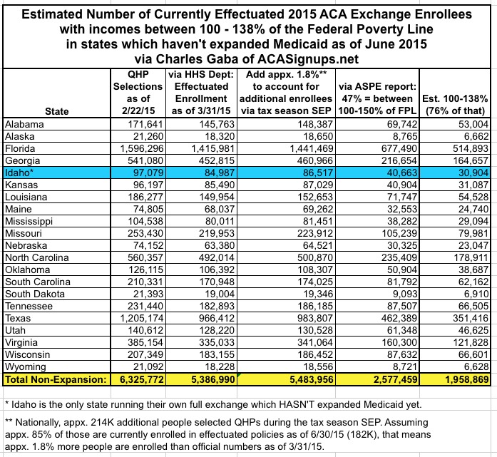 Then I removed the 29 states (+DC) which have expanded Medicaid to date (Montana hasn't officially done so yet, but that should go into effect well before the 2016 open enrollment period, so I counted MT as an expansion state). That leaves 5,386,990 people enrolled in non-expansion states as of 3/31/15. Note that 20 of the 21 non-expansion states are via HealthCare.Gov; Idaho is the only one which hasn't expanded Medicaid but did set up their own exchange.