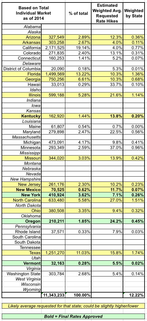 Again, massive caveats surround all 3 of these tables; if one or more of the missing large state not shown ends up with a massive overall hike, that could obviously skew the national average up dramatically. For these states (+DC) however, running the numbers all three ways seems to stay roughly within the same range: Somewhere between 12-13%.