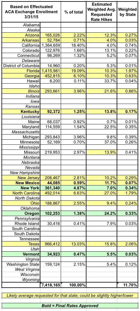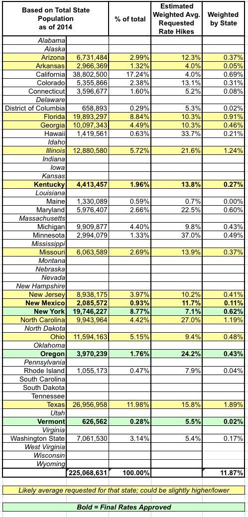 Recently, Richard Simpkins (aka icowrich) gave me the idea to take the known state-wide 2016 rate increase requests and go a step further, by plugging the weighted average rate increases for each state into a spreadsheet and then running a weighted average based on each state's proportion of the total U.S. population, like so (scroll to bottom of this entry for links to analysis for each state):