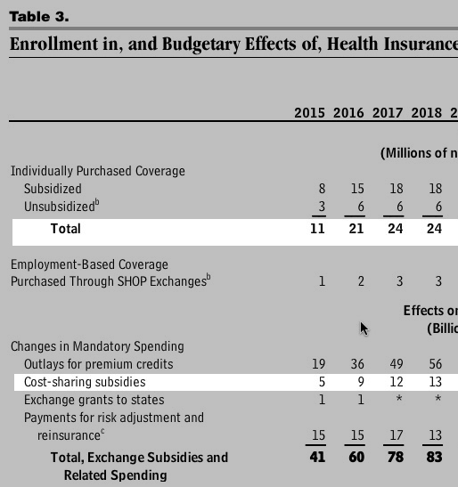 - First, as Andrew noted, back in March the Congressional Budget Office issued an updated projection on ACA enrollment and costs, estimating CSR payments to be roughly $136 billion over a 10 year period.