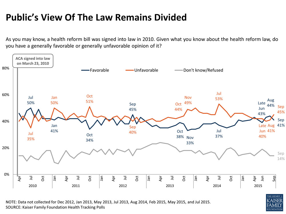 UPDATE: OY!! I screwed up in reading KFF's September poll results; the numbers flipped between August and September, with 45% now opposing the law and 41% supporting it. If that trend were to continue, then yeah, it would be a problem...but again, it's still within the MoE, so it might just be noise. The worst-case scenario still appears to be the ACA being basically a neutral/non-issue one way or the other next year...except, of course, for the fact that every Republican candidate is still claiming a "repeal Obamacare!" stance, which will, by that point, have upwards of 35 million or more people on policies specifically enabled by the law (including the ACA exchanges, off-exchange policies with ACA-mandated coverage, Medicaid expansion and so forth).