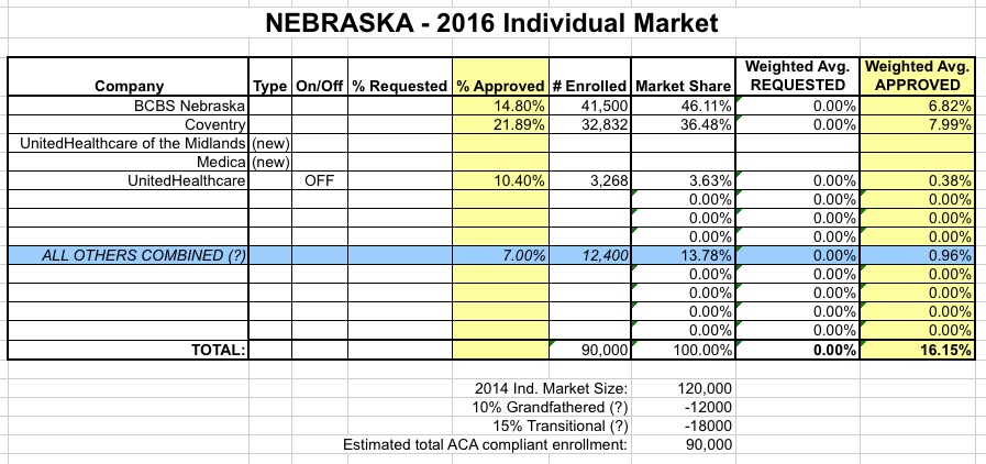 The Nebraska Department of Insurance has published final approved rates for 2016, including premium amounts for 15 different sample scenarios. The approved rate changes are: