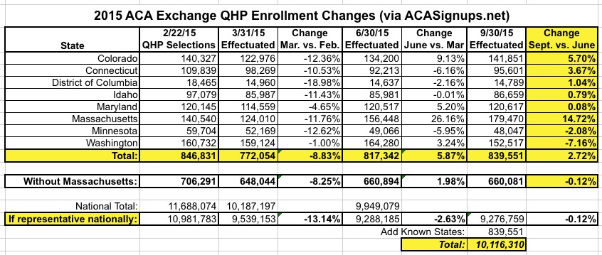 Once again, effectuated exchange enrollments have increased since the end of June. That's a solid increase across 7.5% of the national population. Put another way, across these 5 states (+DC), combined effectuated enrollments have increased 5.8% from June through September, from 603,893 to 638,987. However, I'm going to remove Massachusetts since it's a special cae, which drops the increase to a less-dramatic-but-still-noteworthy 2.7%.