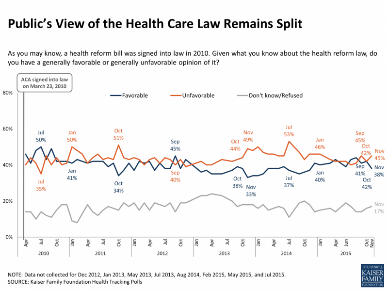 In October, a KFF poll found opinion evenly split on the law at 42 percent. The foundation's September poll showed a more narrow divide, with a 41 percent favorable to 45 percent unfavorable rating. A KFF survey conducted in August showed opinion skewed more favorably, with 44 percent of Americans stating they had a positive view and 41 percent stating they had a negative one.