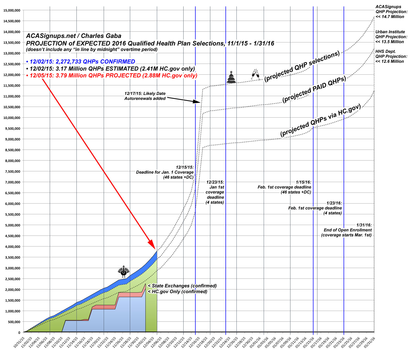 UPDATE 12/03/15: OK, strike that. This has been nagging at me all day. I'm bumping HC.gov Week Five projection up further to 840,000 for 11/29 - 12/05 (2.88 million cumulatively), or around 3.77 million nationally.