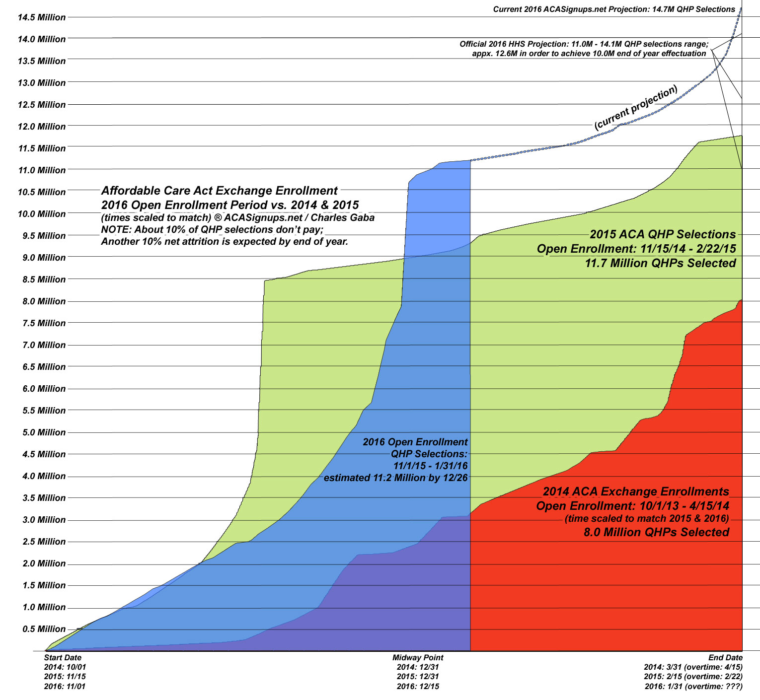 What I've done here is to take the 2014, 2015 and 2016 ACA Exchange Open Enrollment Period graphs and lay them on top of each other. It's important to keep in mind that these are for the open enrollment periods only.
