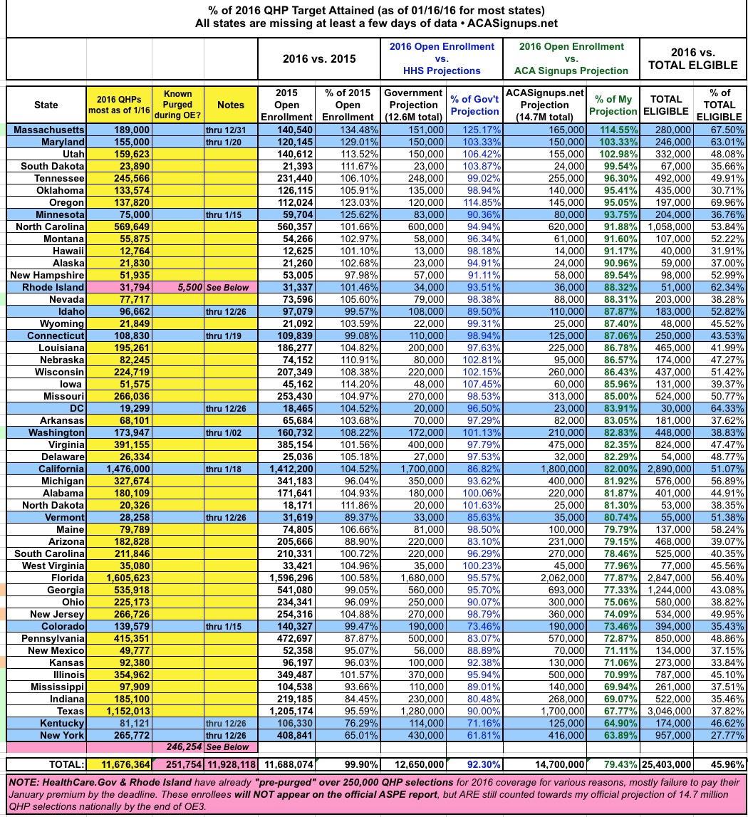 Note that whle the enrollment numbers for most states below are current through January 16th, most of the state-based exchanges are either slightly more current or up to three weeks behind.