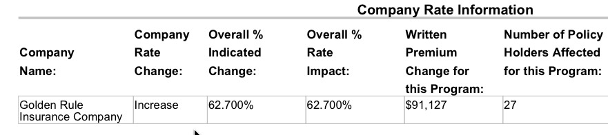 - Golden Rule: At first glance, Golden Rule's jaw-dropping 62.7% average rate hike request may raise some eyebrows...except for one thing: It looks like they only had 49 people enrolled state-wide last year...and if I'm reading Section 21 (Membership Projections) correctly, they're only expecting an average of...32 people this year (388 total projected member months). That's right: Not 32,000. Not 3,200...32. People. Enrolled. In the entire state of Virginia. They even state that "These plans will not be actively marketed, though they will be available for anyone who requests to purchase them." These policies will only be available OFF-exchange anyway.