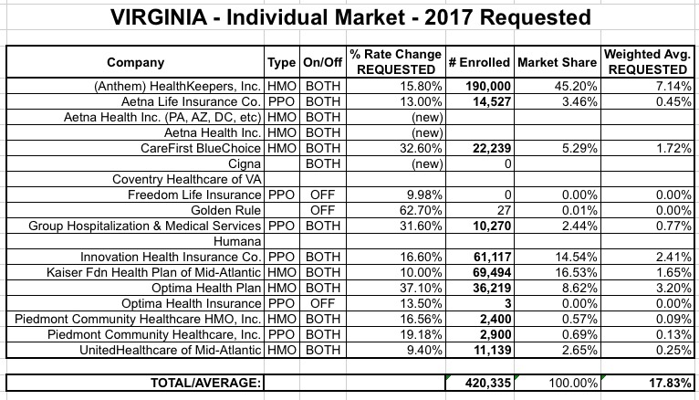 In any event, Humana and Coventry appear to be being dropped in Virginia's individual market, so without knowing how much their enrollees were paying (or where they'll move to next year), it's impossible to factor them into a weighted average. So, until further notice, it looks like I had it right in the first place: Virginia's requested average 2017 rate hike is around 17.9%.