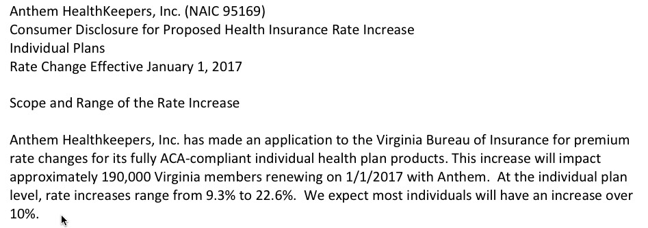 The first filing I found for Anthem HealthKeepers made it pretty clear that they're asking for a 15.8% average rate hike next year which is expected to potentially impact up to 122,581 policy holders: