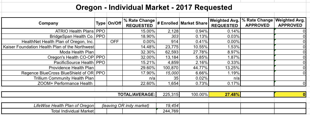 With all that in mind, it looks like the weighted average requested (not approved) rate increases for the Oregon individual market are right around a painful 27%.