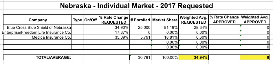 Hmmm...last year Nebraska had 5 carriers offering individual policies, 2 of which were actually divisions of the same company (UnitedHealthcare). Since United is pulling out of Nebraska, this leaves only three companies...one of which is the mysterious "Freedom Life Insurance Co." which keeps popping up in numerous states as not having a single actual enrollee, and almost always asking for the exact same rate hike: 17.37%. What's up with that?