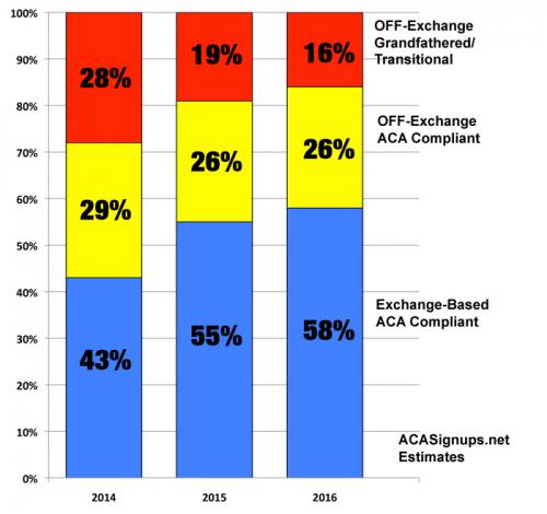 - 2015: 67% ON exchange, 17% OFF-ACA, 16% GF/TR