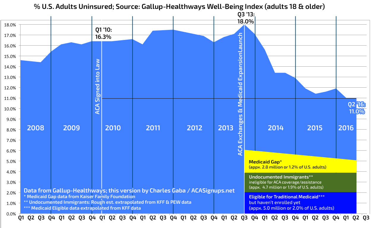 As I do every three months, I'm reformatting their data in a more relevant format, since Gallup seems to be determined not to show the full Y-axis on their graphs (see bottom of entry for original). In addition, I've added some other key data points: Q1 2010 (when the ACA was actually signed into law) and Q3 2013 (when the ACA exchanges and Medicaid Expansion programs launched). Finally, I've added 3 color-coded sections, showing three major categories of the uninsured: Adults who are already eligible for Medicaid but haven't actually enrolled in the program yet; undocumented immigrants who aren't eligible for any taxpayer-funded coverage (or even for full-price exchange-based policies); and the 2.8 million people still caught in the "Medicaid Gap" across 19 states which haven't expanded the program yet. Note that the Medicaid Gap has shrunk from around 5 million in 2014 as a half-dozen or so states have come around; the other two groups may have gone up or down since 2014.