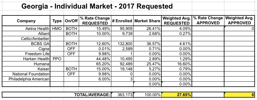 IMPORTANT: This is really just a placeholder for Georgia's 2017 average rate hike requests, because it's extremely spotty and partial so far. I'll update it once I'm able to actually track down the bulk of Georgia's individual market enrollment and rate hike request numbers.