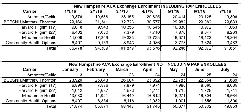 There are three important things to note above: First, "PAP" (or "Premium Assistance Program") is New Hampshire's name for their Arkansas-style "Private Medicaid Option" in which those who qualify for Medicaid expansion are, instead, enrolled in the same QHPs as other exchange enrollees...except that Medicaid funds are used to pay for virtually everything. Think of these as high-metal level QHPs with 99% APTC/CSR subsidies. They're officially categorized as being under Medicaid by CMS/ASPE, so they aren't included as QHPs in the official reports; if they were, New Hampshire would show up as having enrolled a good 30,000 more people in "exchange policies" (Arkansas' number would be much higher as well).
