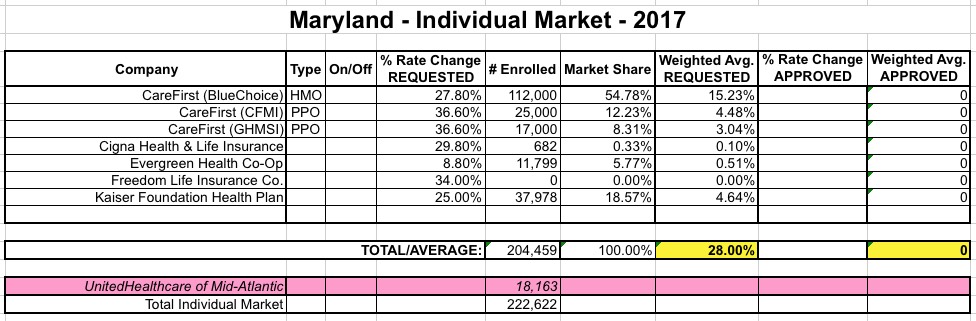 Maryland was one of the first states I ran a weighted average rate request on back in May. At the time, it looked like around a 15.0% average request for the individual market state-wide: