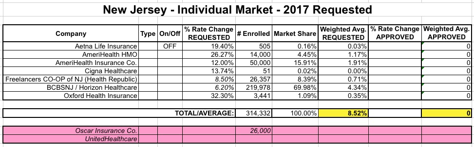 OK. Last week I wrote up a post speculating about the potential impact to the state- and national-level average rate hike requests of Aetna dropping out of the ACA exchanges in 11 states. My conclusion was that the average will increase in some states...but may actually drop in others, since Aetna would otherwise have asked for rate hikes higher than the average requested by the other carriers in that state. Of course, this isn't really a positive development, since their current enrollees are still losing their plans entirely, and since a 50% hike from Aetna could still end up costing less than a 10% hike from one of the other carriers...but as always, this is the best I can do here.