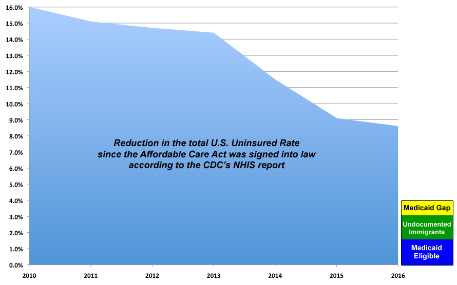 NOTE: Yes, I'm aware that the NHIS had the uninsured rate lower than 16% in 1997 (15.4%) and 2005 (14.2%); the only reason I'm not including them below is because there are too many years missing in between. This is just a quick visual to note the trend as well as what the breakout is among nearly half the remaining uninsured: