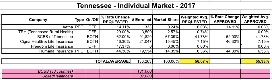 And then there's Tennessee, where Blue Cross Blue Shield asked for and received a 62% rate hike...but even so, just announced that they're dropping out of the individual market completely (both on and off exchange) in 30 counties throughout the state, in the Memphis, Knoxville and Nashville areas: