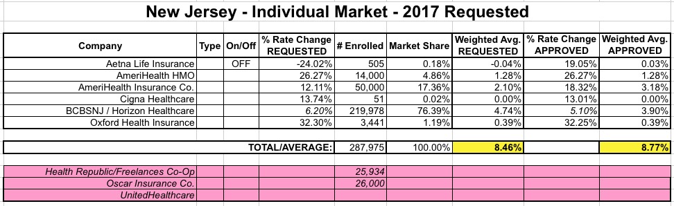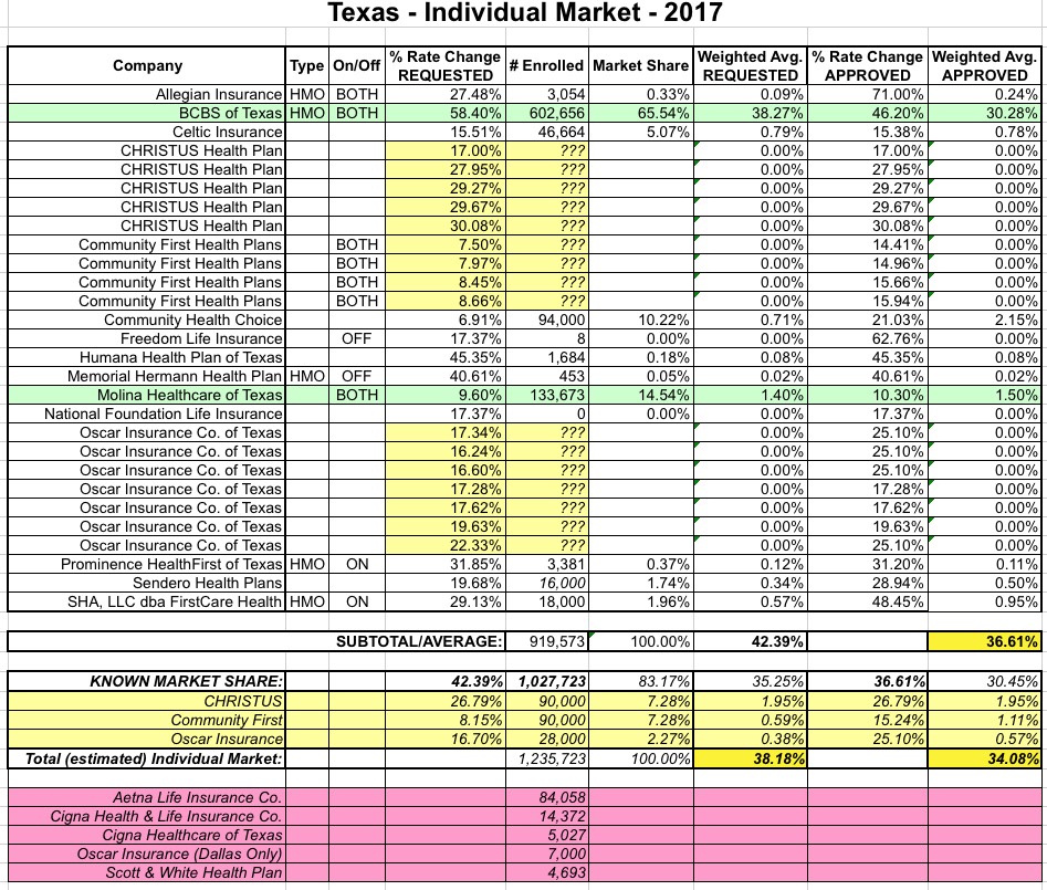 I'm not going to go into a whole lot of detail here, but I will post the updated spreadsheet tables for all five of these states. Combined, they actually bump the national average closer to 26% (mainly due to Texas's 34.1% average), but bear in mind that the requested average rate hikes for four of the still-missing five states came in well below 20%: