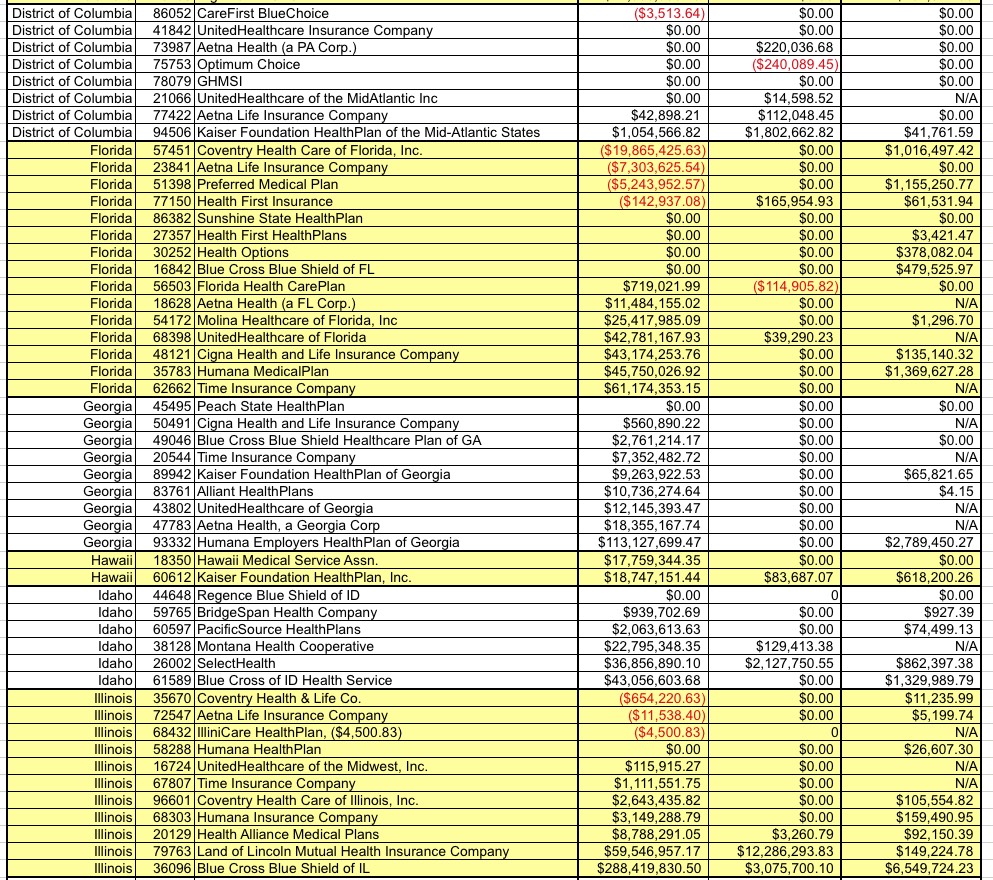 A table follows, listing every carrier across the country which owes money to or is owed money from the Risk Corridor program for 2015, as well as how much 2015 funding will be paid out to them to cover what's still owed for 2014. It's a long list, and some of the numbers are pretty big.