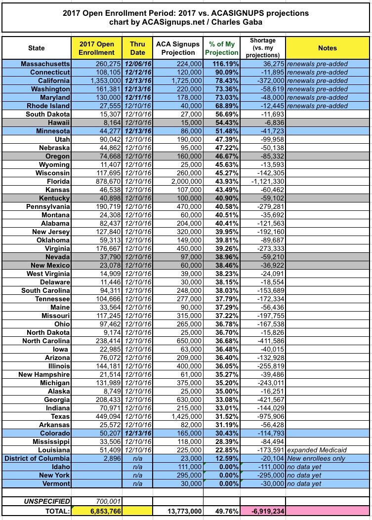 - Six states (MA, CT, CA, MD, RI & WA) can't really be counted as "ahead" because these states have already "pre-loaded" their automatic renewals of existing enrollees. These can't really be matched to the rest of the states until after December 19th, when all of the HC.gov auto-renewals should be added to 39 states.