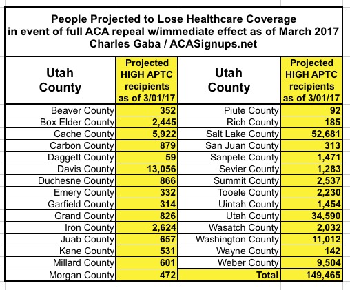 In the case of Utah, assuming 211,000 people enroll in exchange policies by the end of January, I estimate around 149,000 of them would be forced off of their policy upon an immediate-effect full ACA repeal.