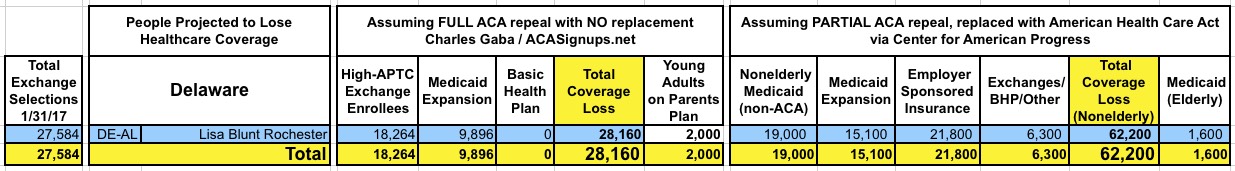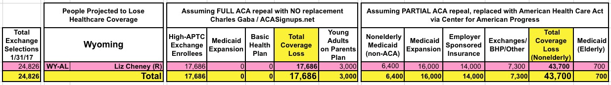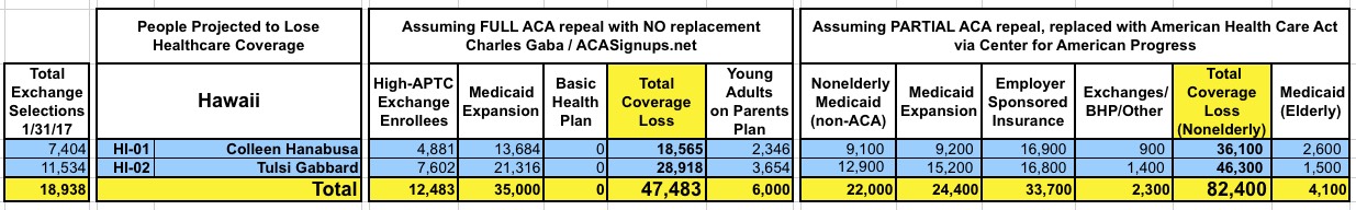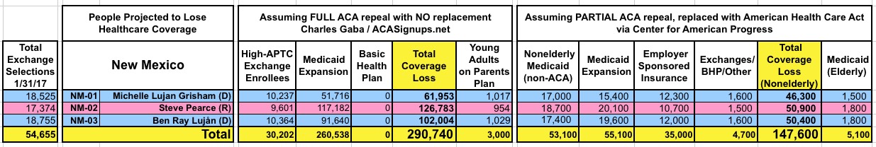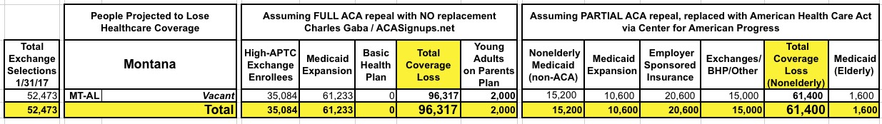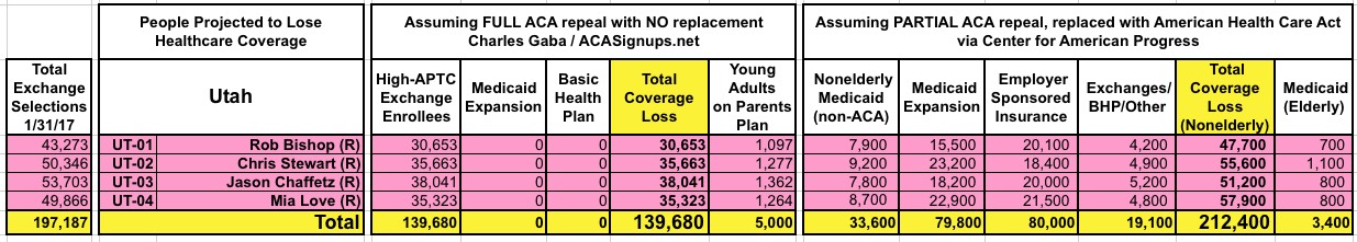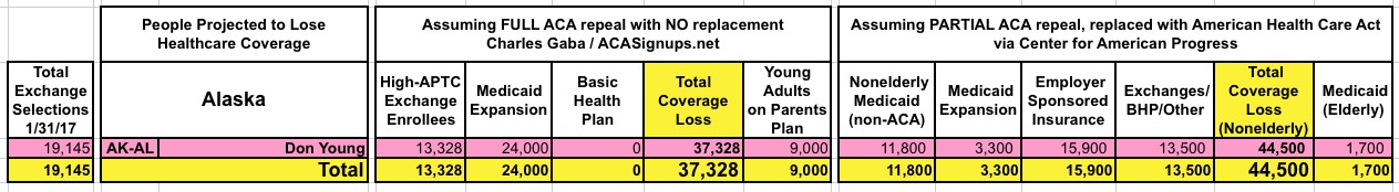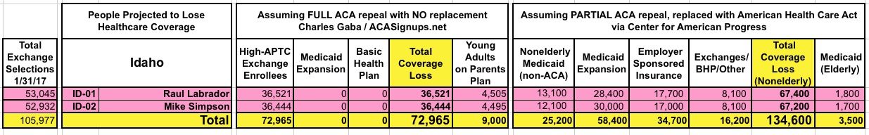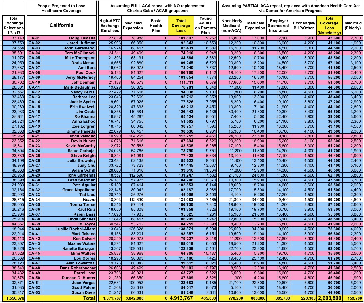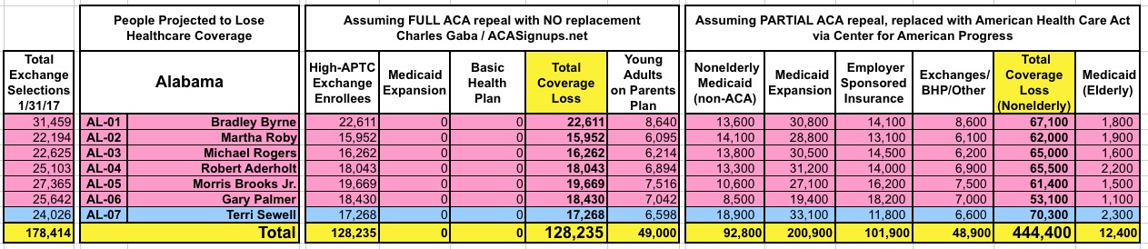 With that in mind, here's state-by-state tables comparing the projected coverage losses in all 435 Congressional Districts under either scenario: Full repeal with no replacement vs. partial repeal/replace via the Trumpcare bill. As you can see, the totals within each CD or state are considerably higher or lower in some cases...but the grand total still somehow ends up being roughly the same nationally.