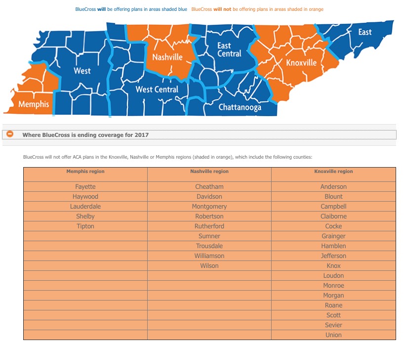 Figuring out which ACA-compliant policies are available OFF-exchange is trickier than you might think. The ON-exchange plans are all listed via Data.HealthCare.Gov, and while all of those are also available off-exchange as well, that doesn't do any good in this situation. HC.gov does have an off-exchange ACA-compliant plan finder as well, but it's incomplete; not every carrier is listed. In fact, I tried plugging in zip codes for all 16 of the TN counties in question and it didn't kick back a single result (whereas plugging in Oakland County, MI brought up 67 plans...and Carter County, Tennessee lists 4 of them, all from BCBS TN).