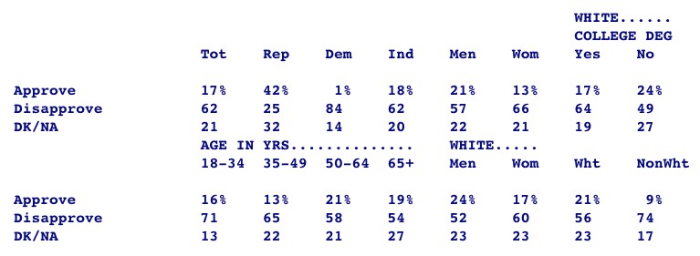 Holy smokes! Both "strong" and "somewhat" approval is exactly the same as in March (6% and 11%), but take a look at the disapproval numbers: All 6 extra points of disapproval have been added to the strong category.