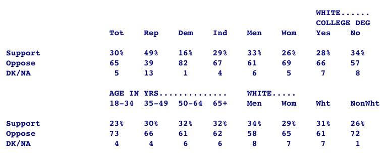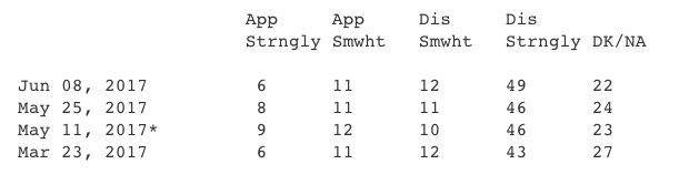 As alluded to above, note the trendline--not only is Approval of the AHCA still stuck at a pathetic 17%, check out the trendline: Disapproval of Trumpcare has increased by another 6 points since March, and now overwhelms approval by a 3.6 : 1 margin.
