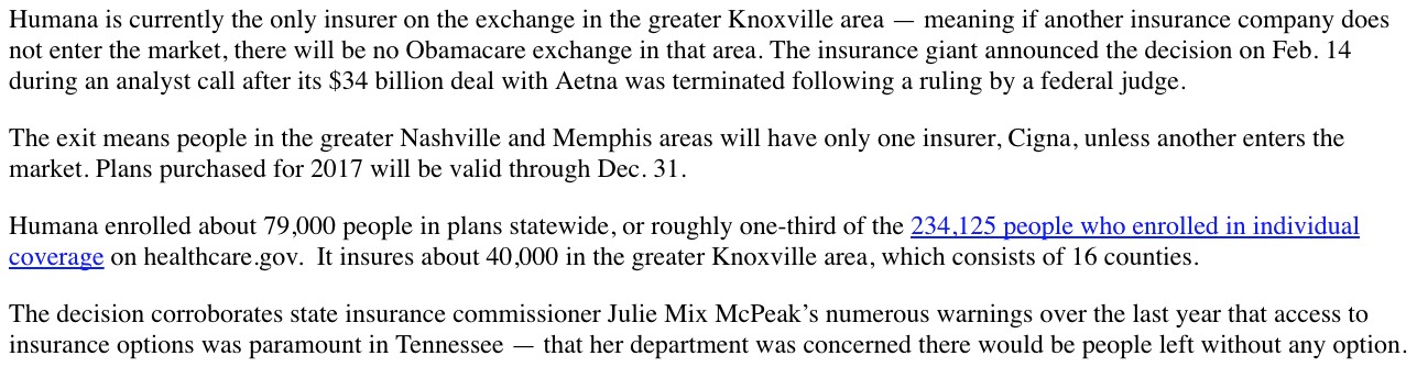 This year, to the best of my estimates, Tennessee's total individual market consists of roughly 300,000 people, around 2/3 of whom are enrolled via the federal ACA exchange. Humana is dropping out of the state next year, meaning roughly 79,000 enrollees will have to shop around.