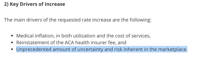 Interestingly, while Medica's rate filing letter clearly states that the 16.9% request assumes CSR payments will be made and the mandate will be enforced, they also list "unprecedented uncertainty/risk inherent in the marketplace" as one of the key drivers of the increase.